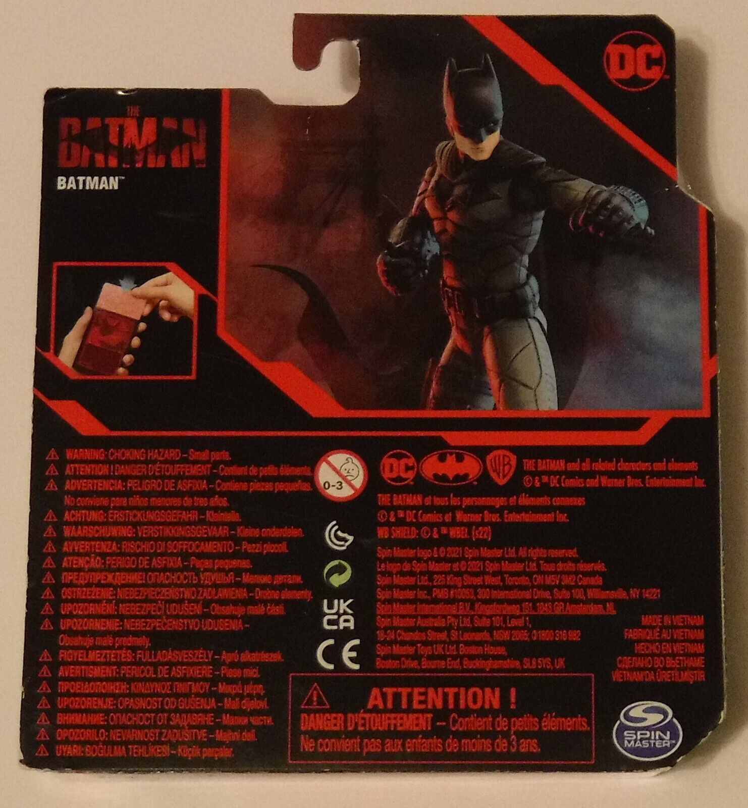 This listing is for DC Comics action figure depicting Batman from the movie, "The Batman". The figure is New in the original unopened retail package. It is complete with accessories. It is recommended for ages 3 and older. Also included is a mystery card.