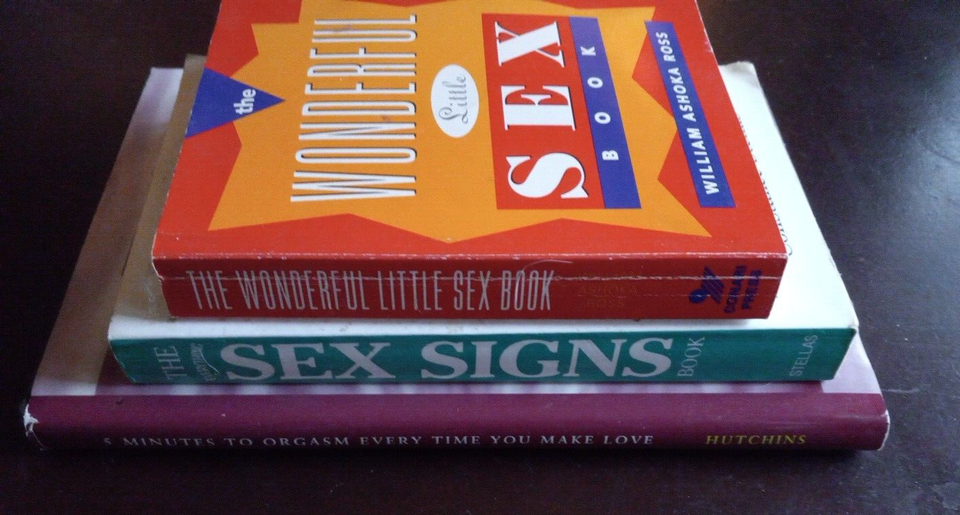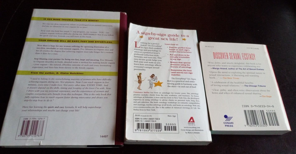Nice used condition, most wear on Everything Sex Sign Paperback with wear to corners and name written on inside front cover. Some tanning on pages due to age in 5 Minute orgasm and some corner folds. All txt is readable, I see NO underlining or writing throughout books.