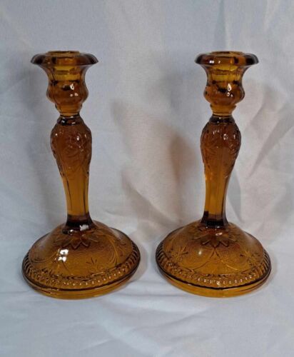 Set of 2 Candle Stick Holders Tiara Amber Indiana Glass Sandwich Design 8.5” EUC