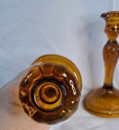 This beautiful set of 2 candle stick holders is made by Indiana Glass in the Tiara Amber Sandwich Design. They are perfect for holding taper or dinner candles. The glass is of high quality and has a beautiful amber color. The design is intricate and shows the craftsmanship of the artist.