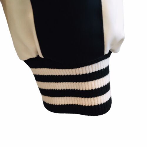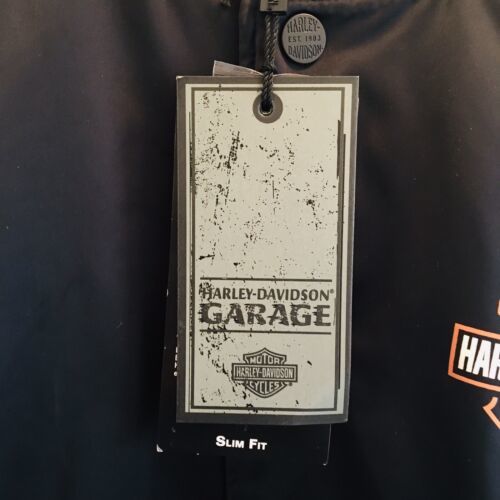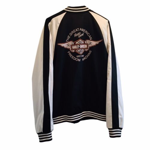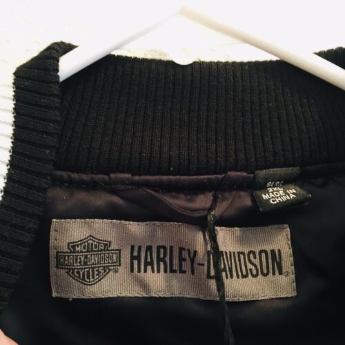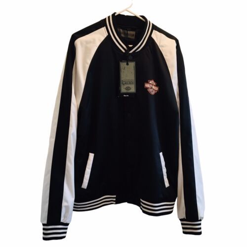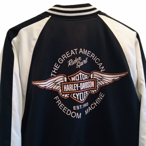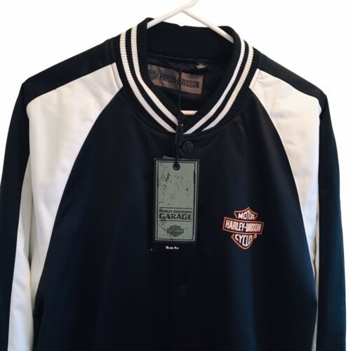 Sport the 80s era in this men?s Harley Davidson Garage Slim fit 2XL, Colorblock Winged Logo Bomber Jacket. This satiny, lined, and filled-for-warmth jacket is a bold tribute to black-and-white retro look that includes snaps etched with our name and "Est. 1903." A junior-sized Bar Shield logo on the front, and a jumbo-sized Winged Bar Shied logo with a freedom-inspired motto fills the back. Retro flair continues with striped, rib-knit detailing. 100% polyester, this men?s casual jacket is part of our Garage Collection. Retail price tag reads, $150.