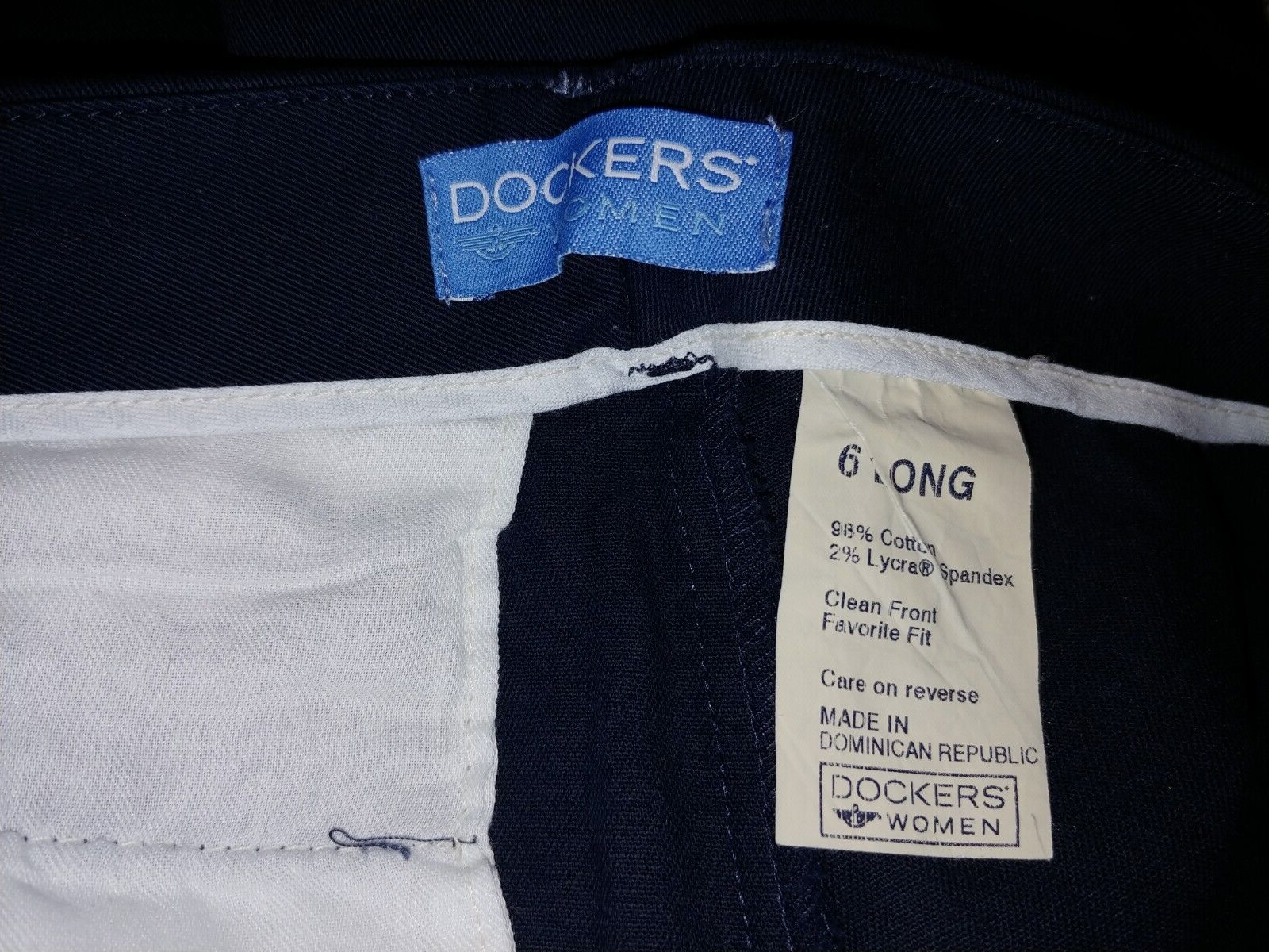 THIS IS A GREAT PAIR OF LADIES DOCKERS WOMEN NAVY COTTON/SPANDEX PANTS IN A SIZE 6L. THEY ARE IN EXCELLENT, BARELY WORN, CONDITION.