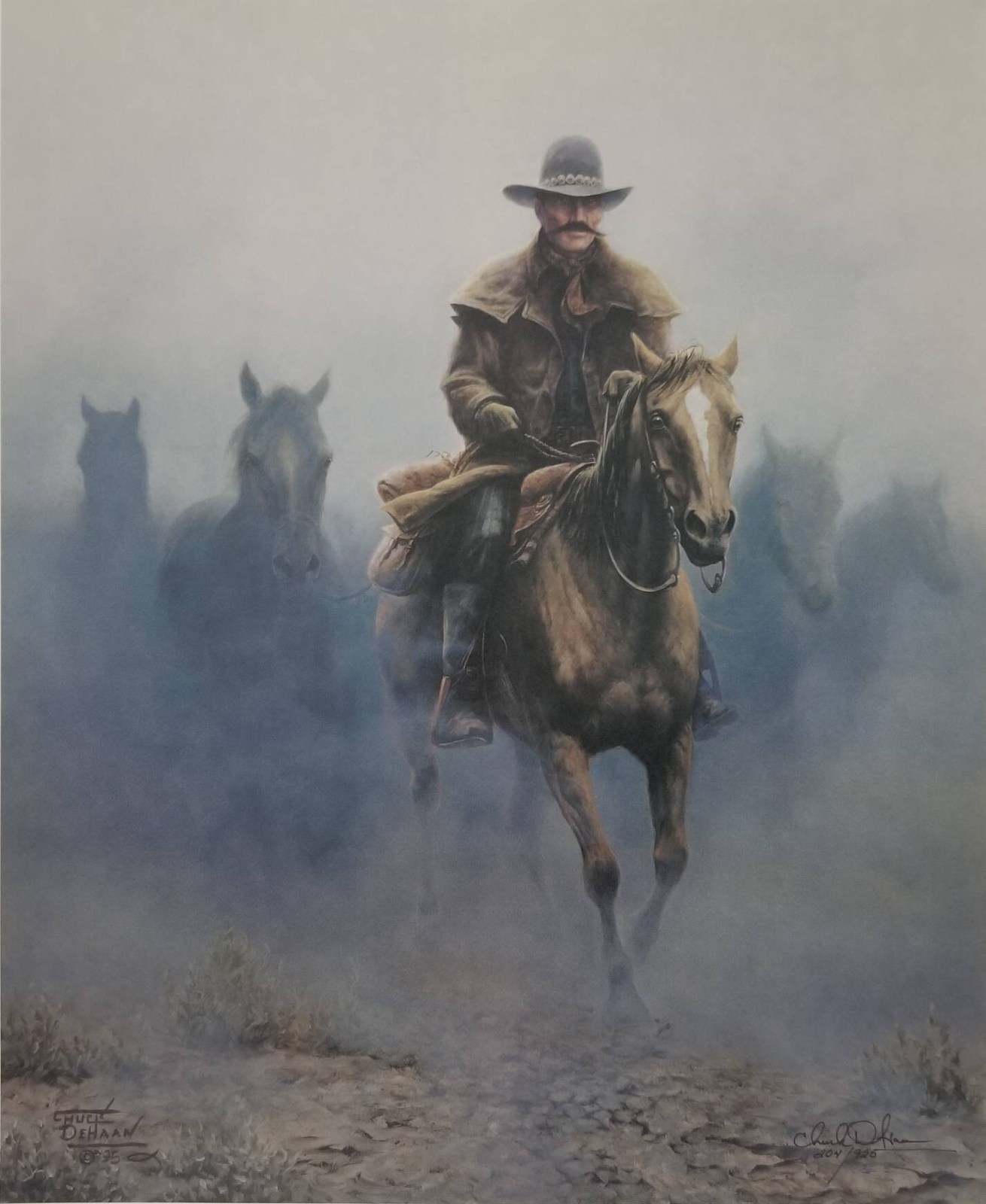 DeHaan paintings are noted nationwide for their exceptional portrayals of the West?its unique beauty and history and the proud spirit of its people. His approach to painting is a natural outgrowth of his own experiences. As an accomplished rodeo rider, rancher, and cutting horse trainer, this multifaceted man has successfully intertwined the threads of art and ranching throughout much of his adult life. Chuck has achieved a well-deserved reputation for artistic skill among his contemporaries in the arts, as well as with the many collectors who own his prints and paintings. He has done artwork for many Western magazine and catalog covers, and even headed up his own advertising agency for twelve years.