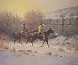 Along The Canyon Wall is a signed and numbered limited edition print by G Harvey. This piece depicts bundled up cowboys with their horses riding along a river in a canyon with fresh fallen snow on the ground. You can feel the cold as you can see the breath of both riders and horses, as they travel along the trail.