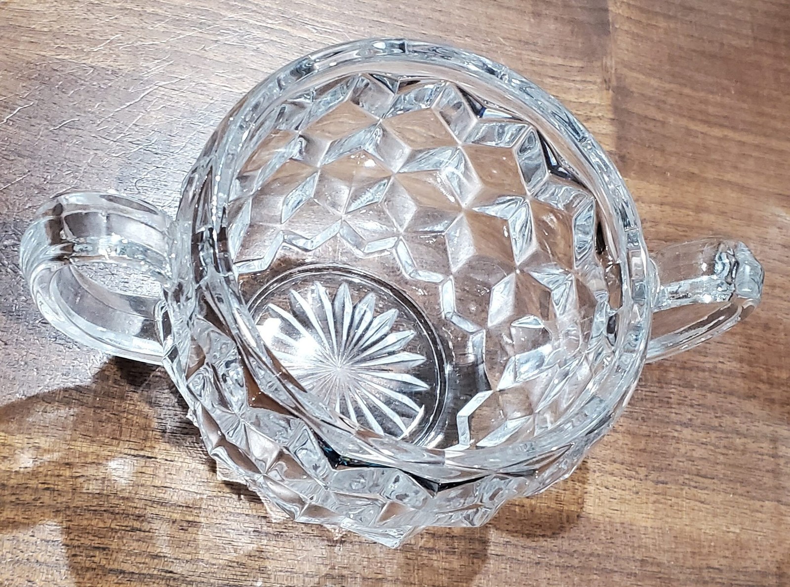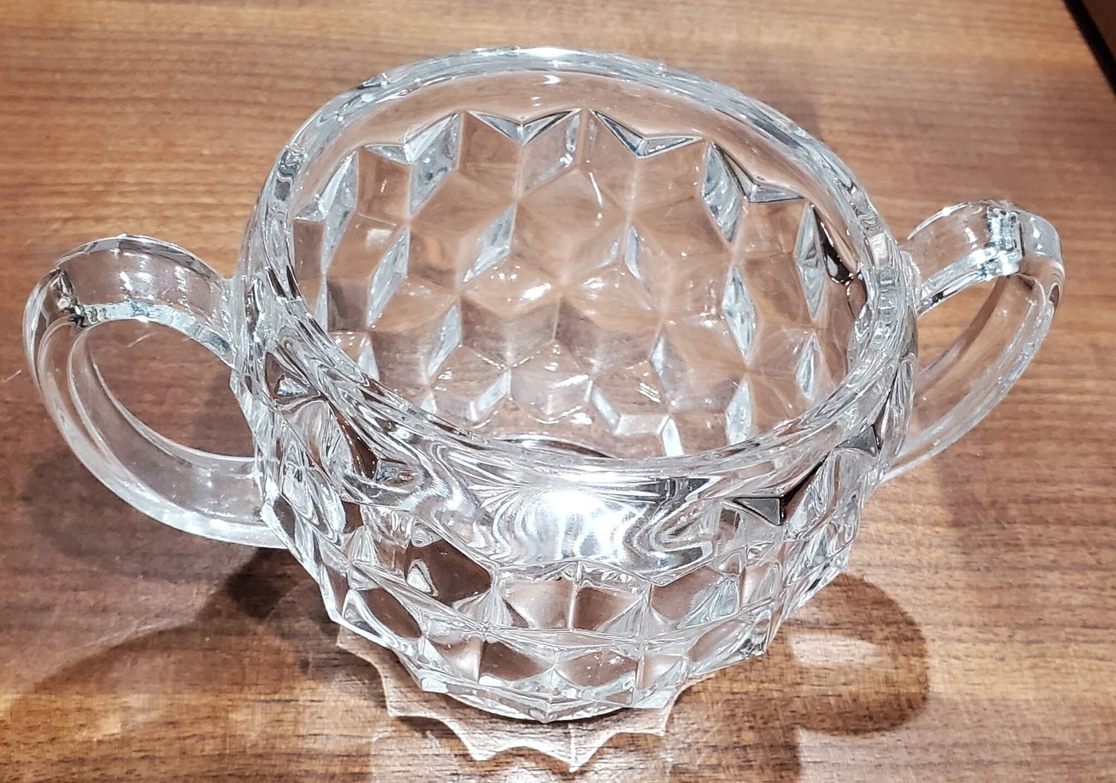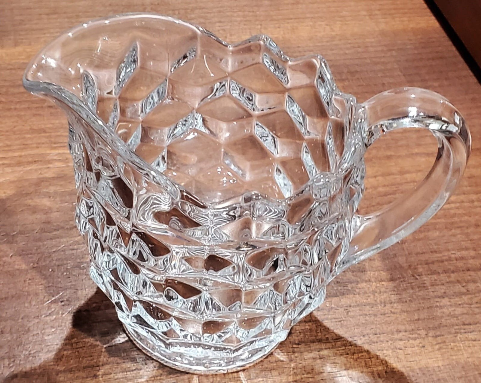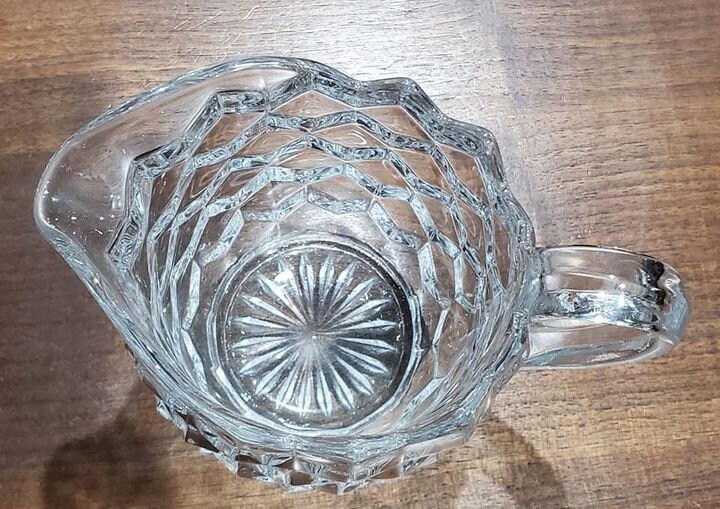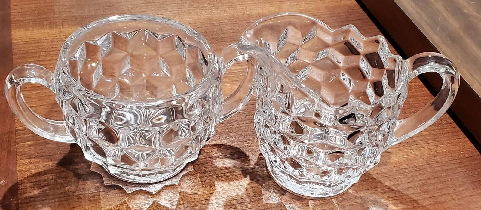 Produced from 1939, this gorgeous cream and sugar set by Fostoria is the perfect gift for anyone that likes to make their morning coffee routine special. The classic, American pattern of stacked cubes is mesmerizing to look at and a charming vessel for your favorite coffee accoutrement. The set would compliment any decor. When the light hits it, they look amazing!