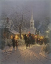Village Carolers is a limited edition print by G Harvey. This piece depicts turn of the century carolers singing in front of the church with a horse pulling a family in a sleigh on the snow. covered road.