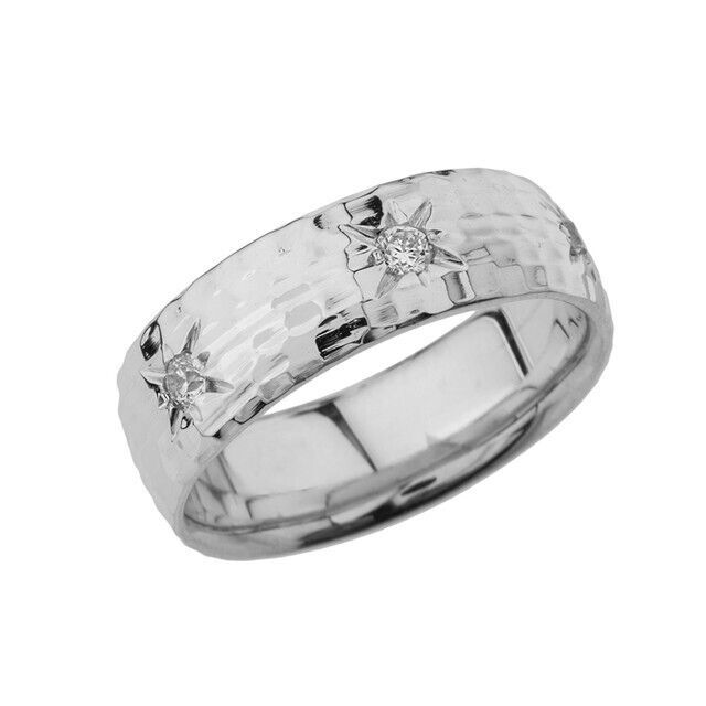 White Gold 7 1\2 Hammered Diamond Mens Wedding Band