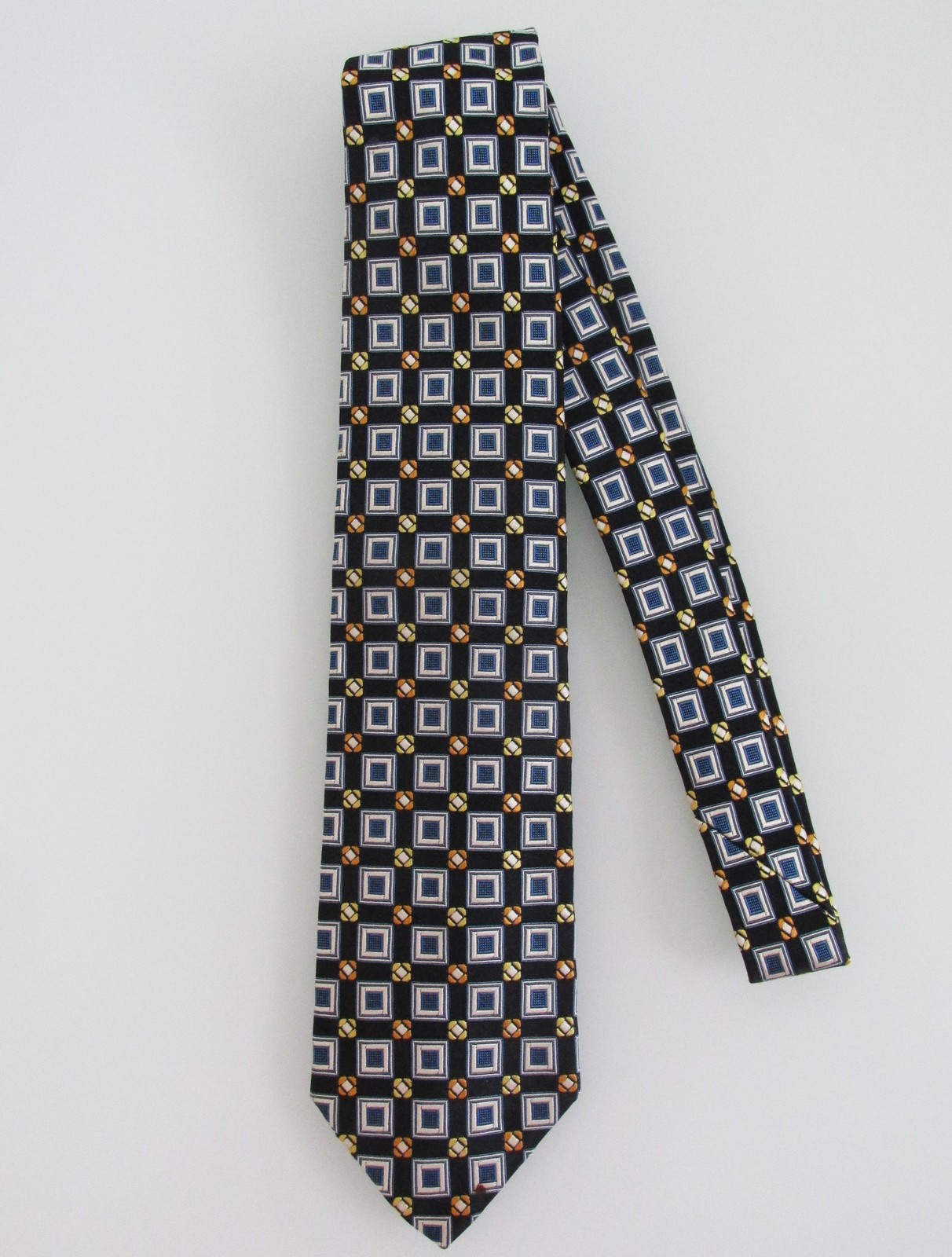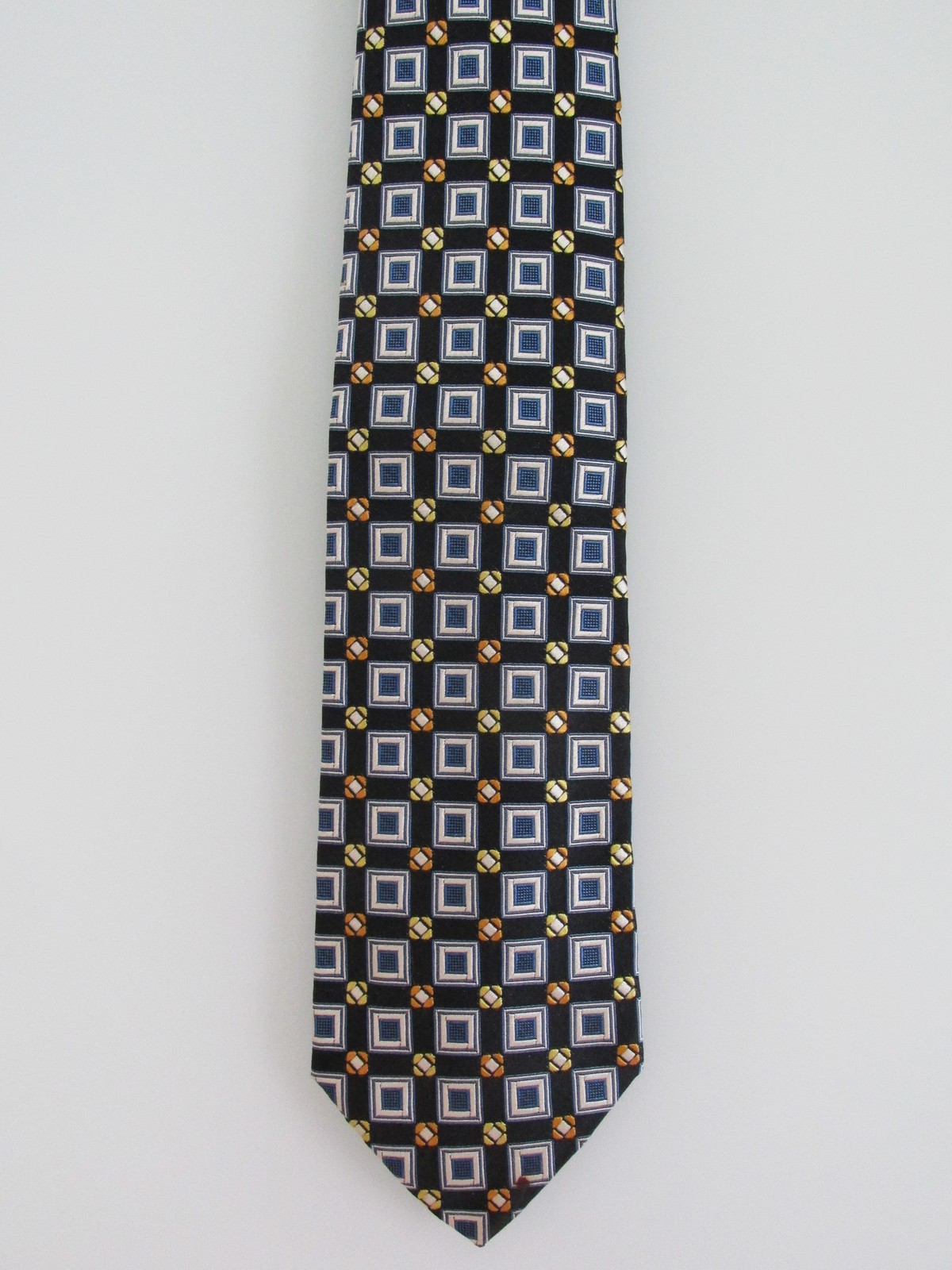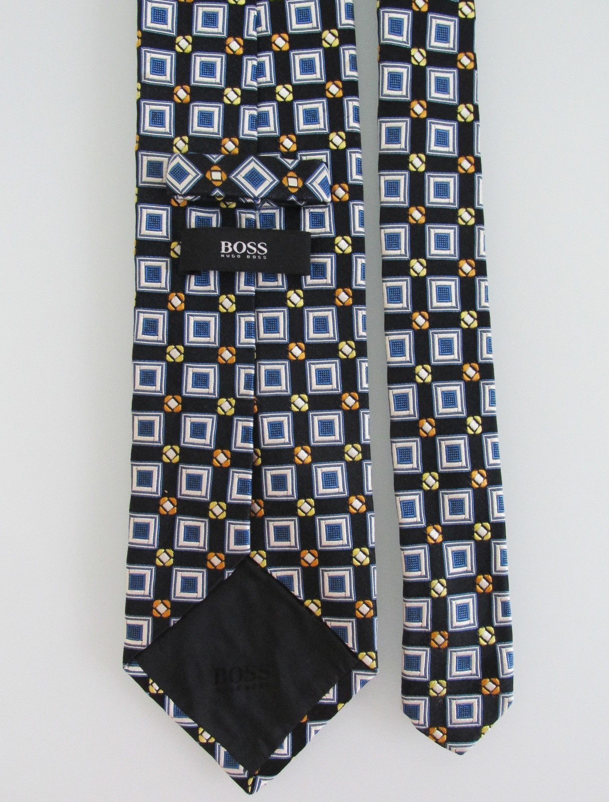Description: Up for sale is a Hugo Boss men's silk tie. The tie is handmade in Italy of 100% silk. It has a contemporary pattern in blue, silver, copper, and gold on a black background. Dimensions are approximately 58" long x 3.50" wide. This tie is in excellent condition.