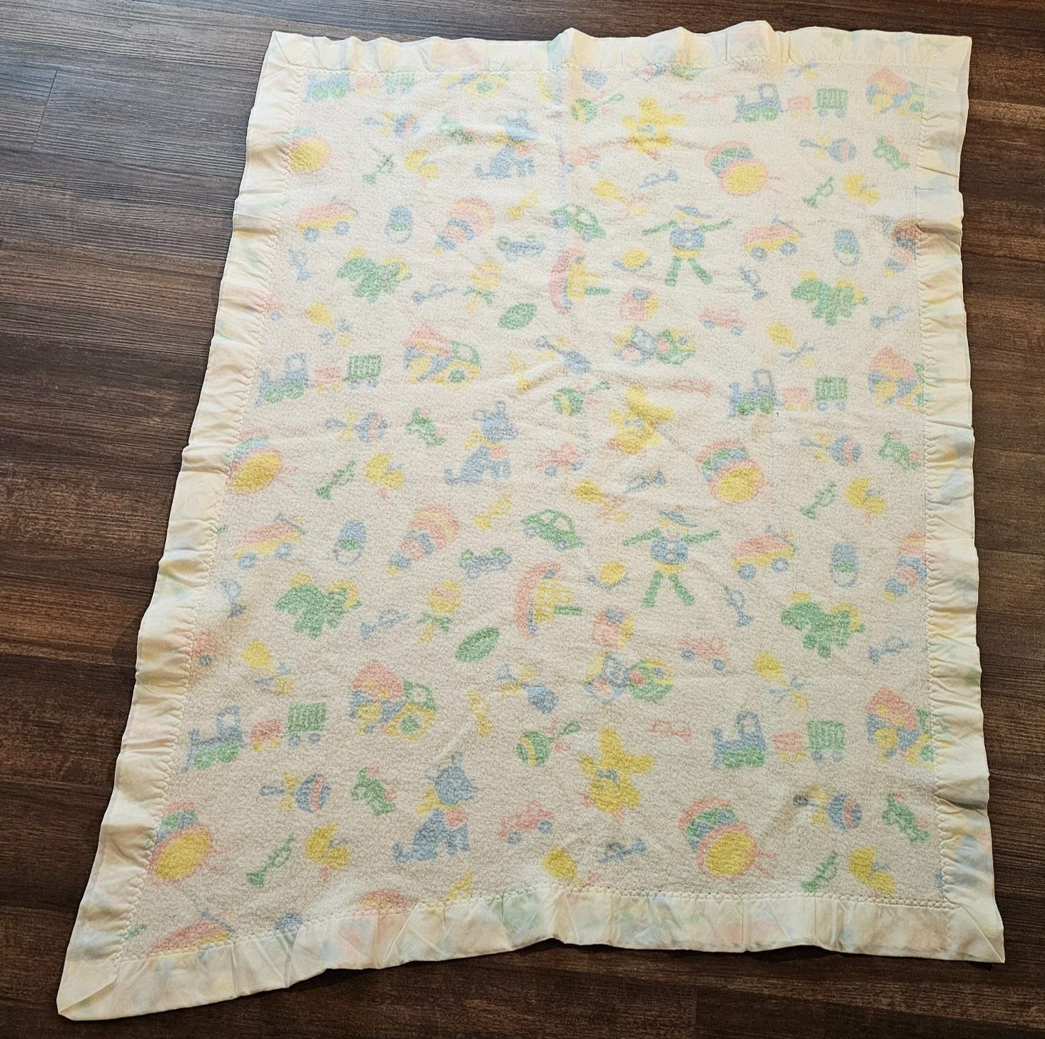 Vintage 70s 80s Acrylic Pastel Baby Blanket Nylon Satin Trim Edge Bear Dog Toys