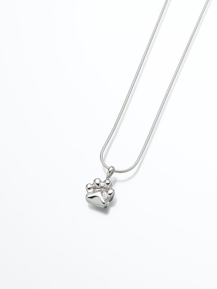 This paw shaped pendant is a beautiful way to treasure your loved one. The pendant is designed to hold cremated remains, a lock of hair, ceremonial dried flowers, or soil from the burial site. Some pendants can also be engraved and placed in a display dome.