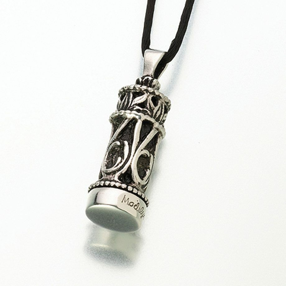 This filigreed cylinder pendant is a beautiful way to treasure your loved one. The pendant is designed to hold cremated remains, a lock of hair, ceremonial dried flowers, or soil from the burial site. Some pendants can also be engraved and placed in a display dome.
