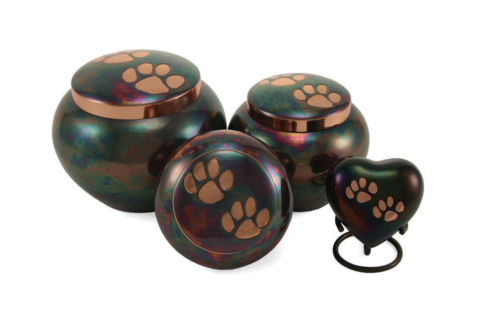 ยท Made of brass with a raku finish, featuring two large bronze paw prints on the lid