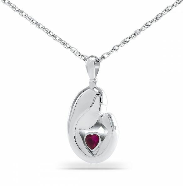 This heartwarming pendant captures a mother?s embrace with a striking deep red stone at its center. Crafted from quality stainless steel, it offers a lasting way to honor a loved one.
