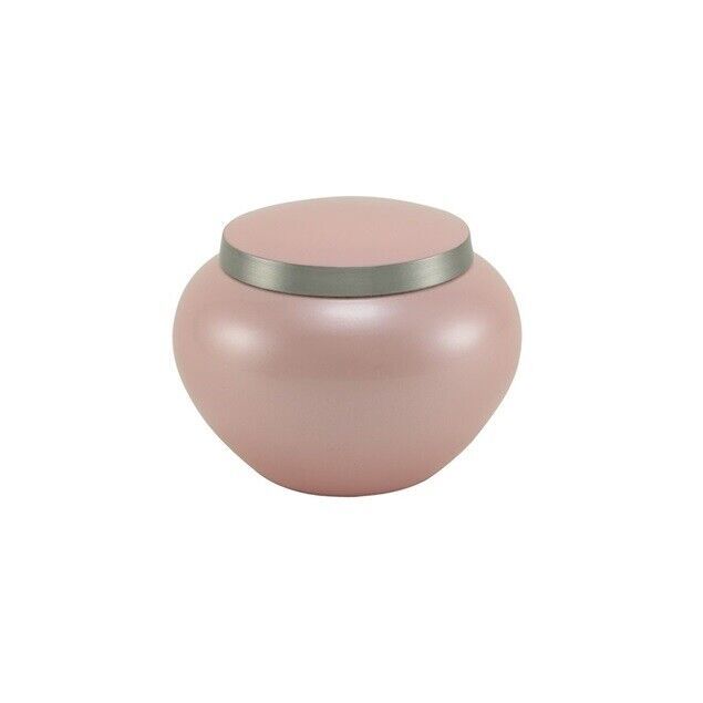 · Signature metal urn is made of durable and cost-friendly aluminum, featuring a soft pink finish and pewter accents.