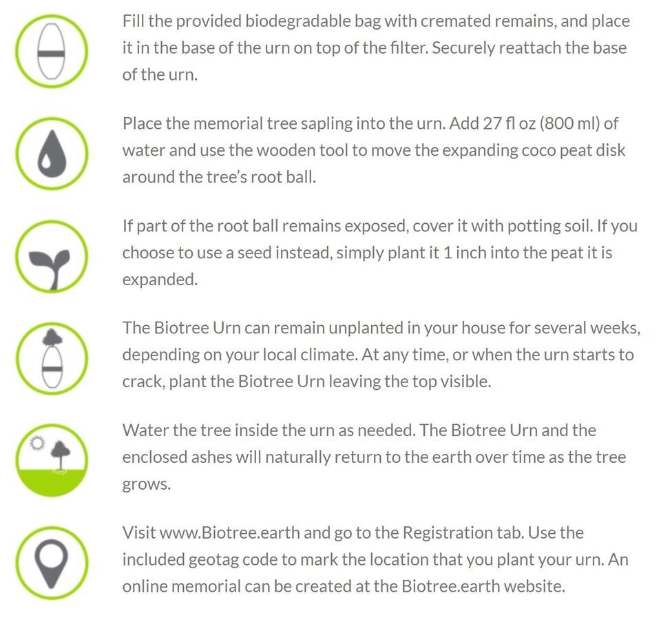 It is easy to set up. First, fill the bag with ashes, put it in the base, then put the urn back together. Plant the tree sapling and pour 27 fl oz (800 ml) water into the urn to activate the expanding coco peat disk. Make sure the entire root area is covered in soil. When the urn starts to crack, which would be several weeks later, you can plant the entire urn in the garden or a large and deep pot or planter box.