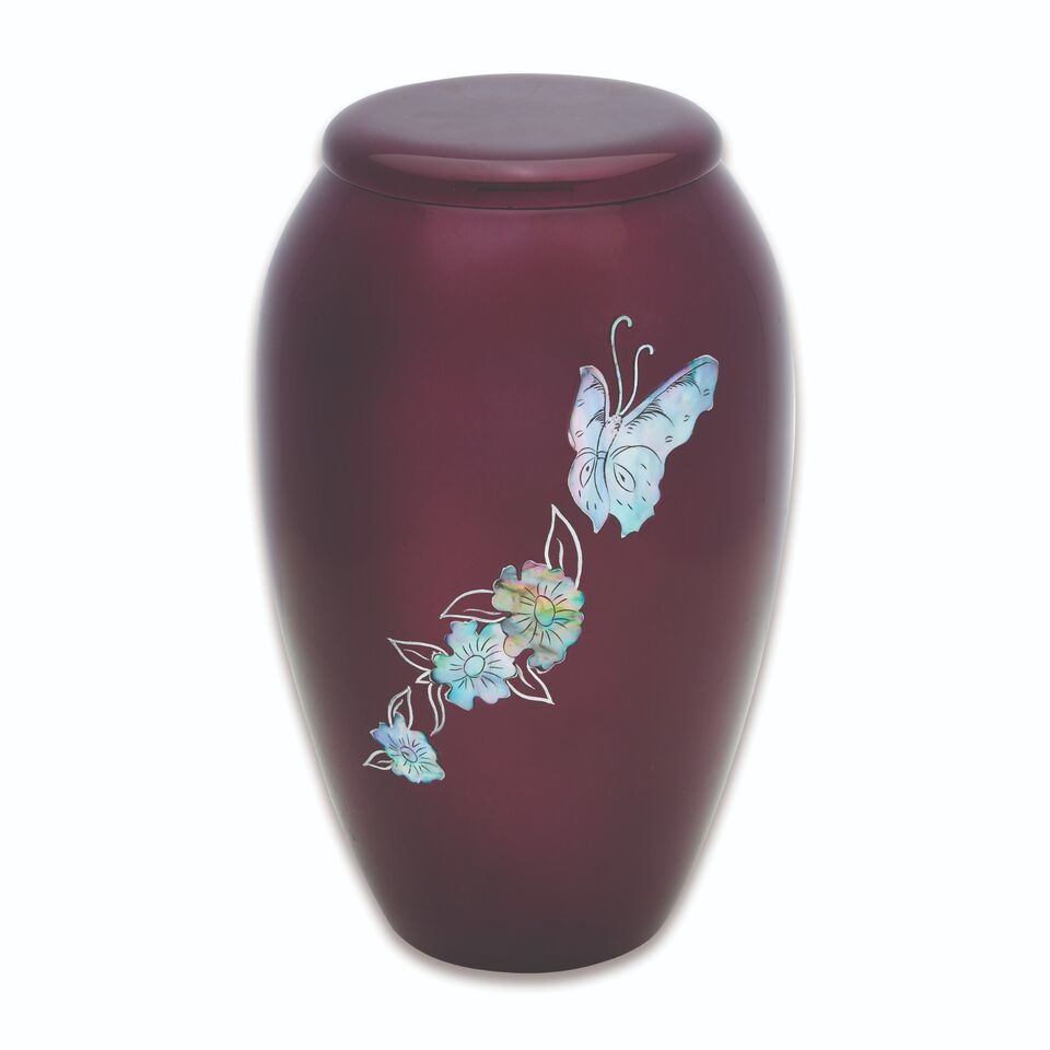 The Burgundy Butterfly brass urn features mother of pearl flowers and a butterfly on a burgundy colored urn. This urn features a flat top lid. It is made of 100% aluminum and come with a threaded, airtight screw on lid to ensure contents remain securely in place. Craftsmen cut Mother of Pearl pieces and hand glue it on the urn. Then several layers of lacquer are applied by skilled artisans to ensure a high quality finish.
