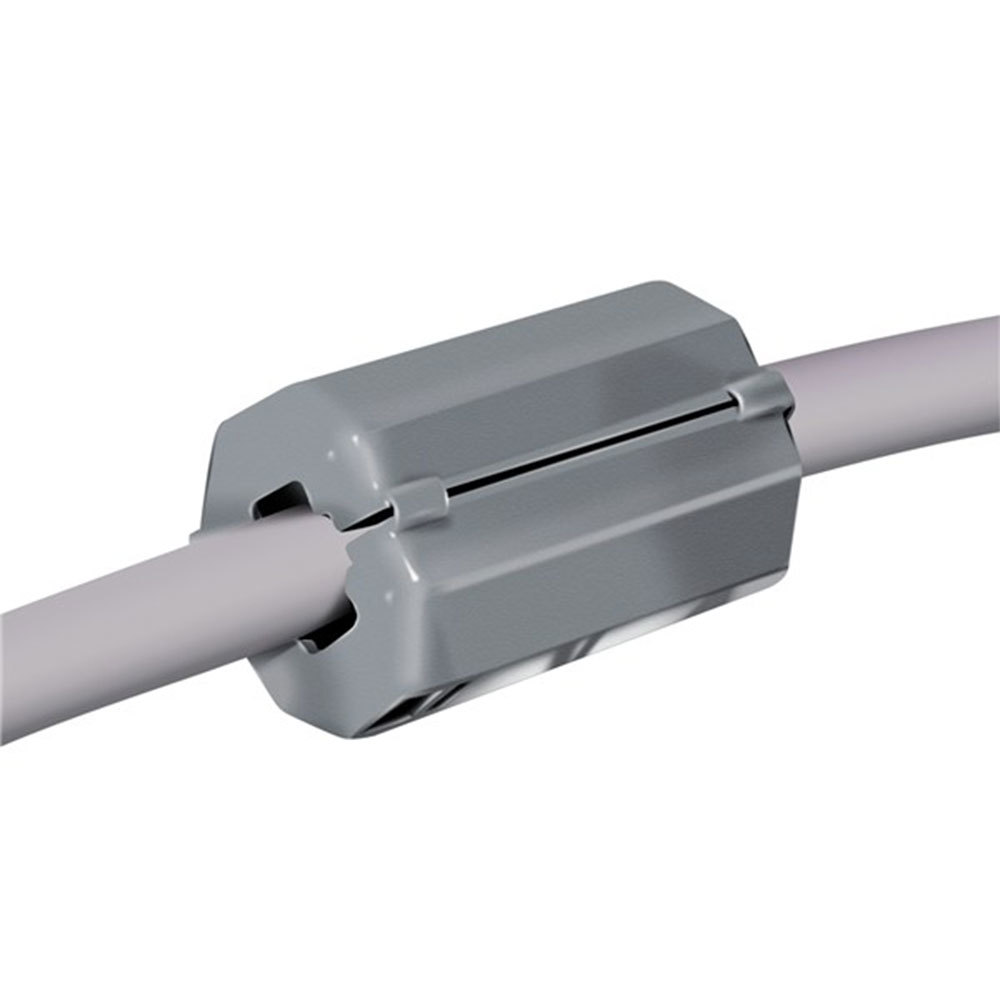 Basically a split high permeability ferrite core with a plastic case, these devices are ideal where parasitic voltage spikes are a problem or potential problem. The cores come in a hinged plastic case, simply snap on to the computer or data cable. Three versions are offered which cover most computer leads etc.MODEL U16:A compact attenuator that will pass a cable up to 8mm dia (most monitor cables etc). Typical impedance at 25MHz 300ohms approx, 590ohms at 100MHz dropping off after that. Case measures: 20Lx19Dia mm.- Pack 4