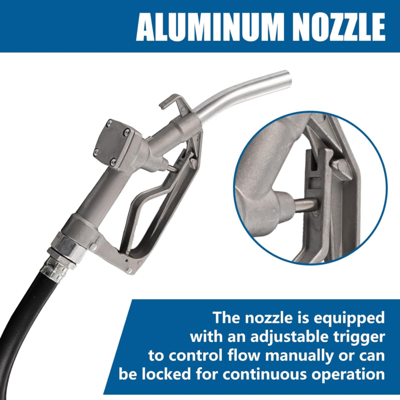 ??Safety and Reliability?Our fuel transfer pump includes an inner bypass valve that protects the diesel fuel pump motor from burning out when it gets clogged. Additionally, the motor has an auto-stop function that stops pumping when the liquid comes into contact with the gun. Our aluminum nozzle is equipped with an adjustable trigger, allowing you to control the flow manually or lock it for continuous operation.