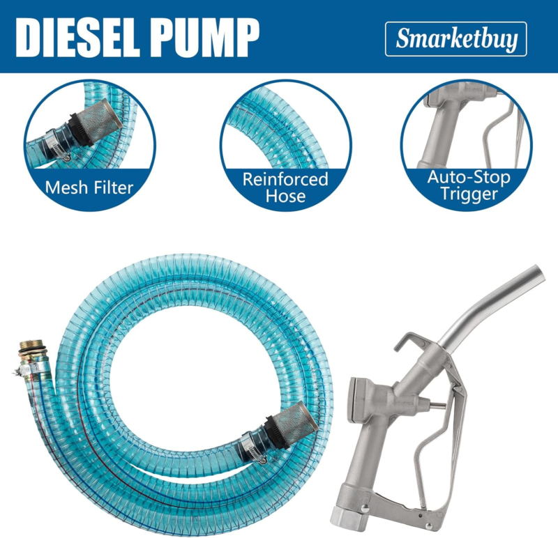 ??Complete fuel transmission system?The fuel transfer pump kit includes an inlet hose measuring 6.6 feet and an outlet hose measuring 13.1 feet, along with a convenient nozzle. Accurate fuel gauge (in liters) with large digital display for easy reading. The inlet pipe features a mesh filter at one end to ensure the flow of clean diesel or kerosene fuel, providing protection for the pump by preventing any potential damage. The reinforced hose is durable and ensures safe and long-term use.