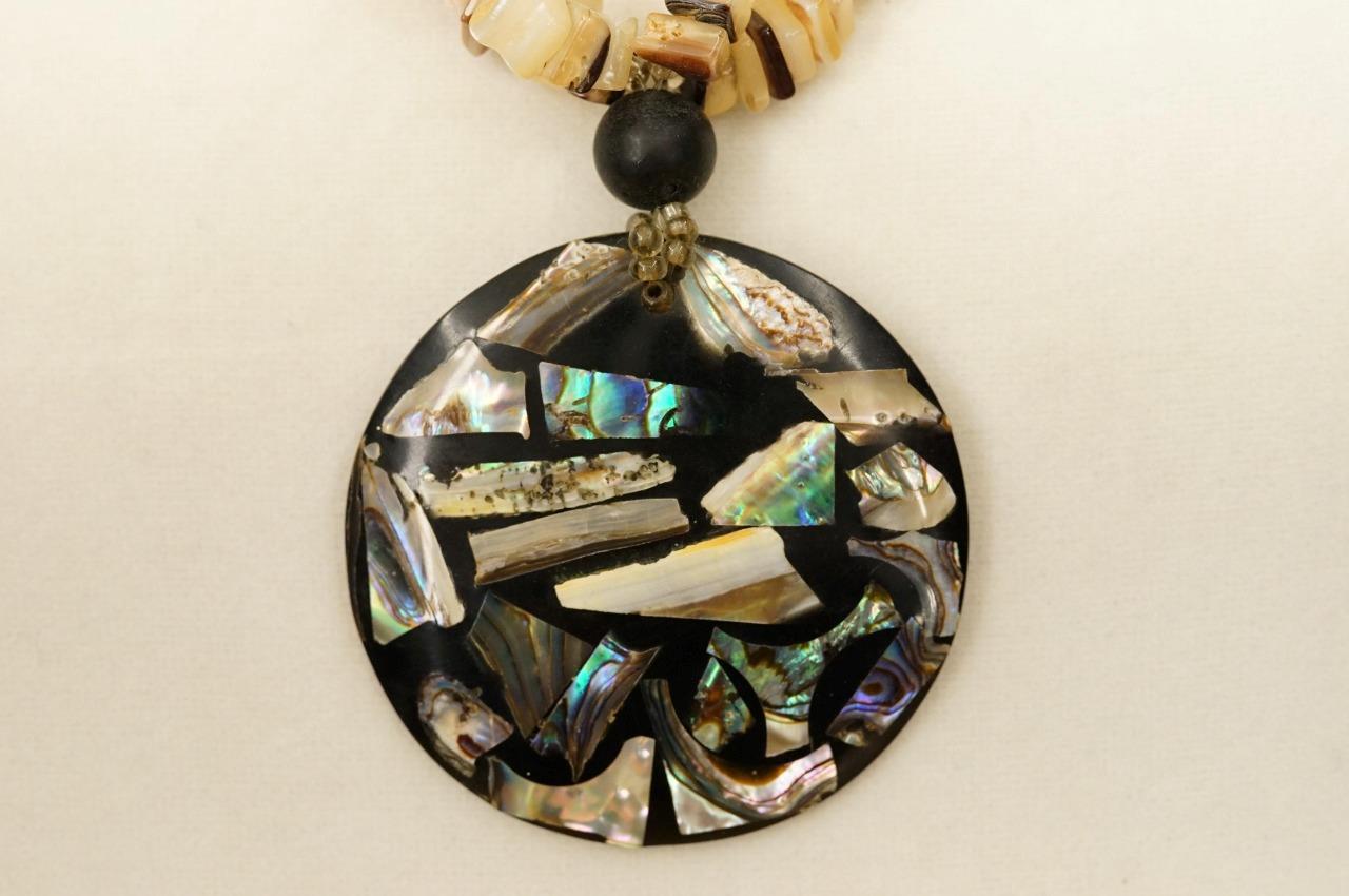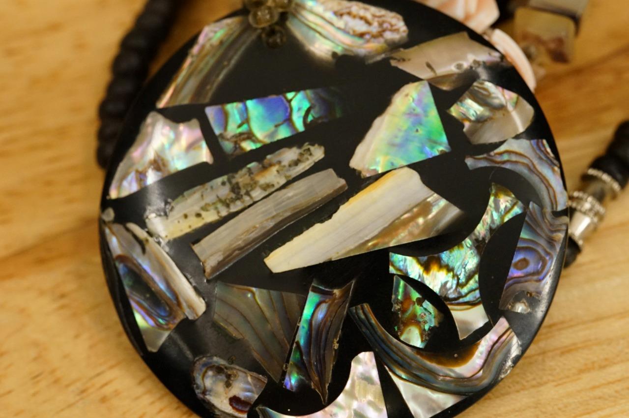 Hawaiiana Jewelry Artisan Beaded Wood Paua Shell Agate Abalone Pendant Necklace. 22" long. the accent pendant measures 2.25'' across.