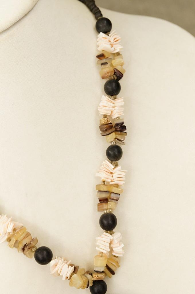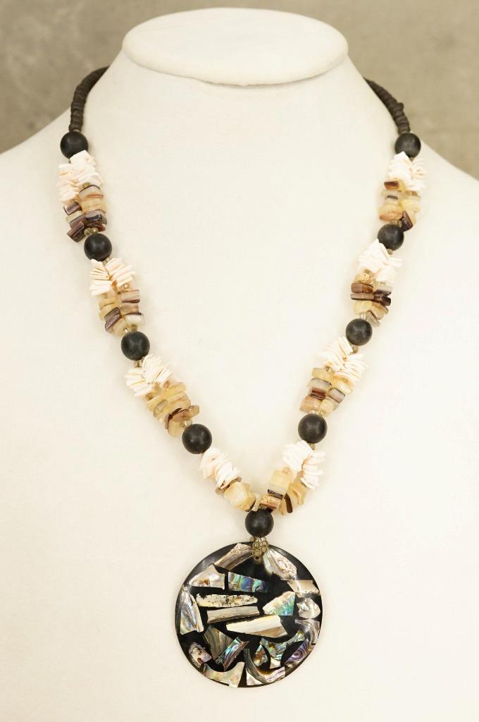 Hawaiiana Jewelry Artisan Beaded Wood Paua Shell Agate Abalone Pendant Necklace