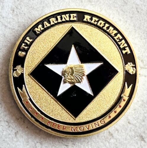 This is a great looking 6th Marine Regiment challenge coin. Coin is about 1 9/16" in diameter. This coin has a 6th Marine Regiment insignia on front in raised lettering and the Marine Corps logo on the reverse.