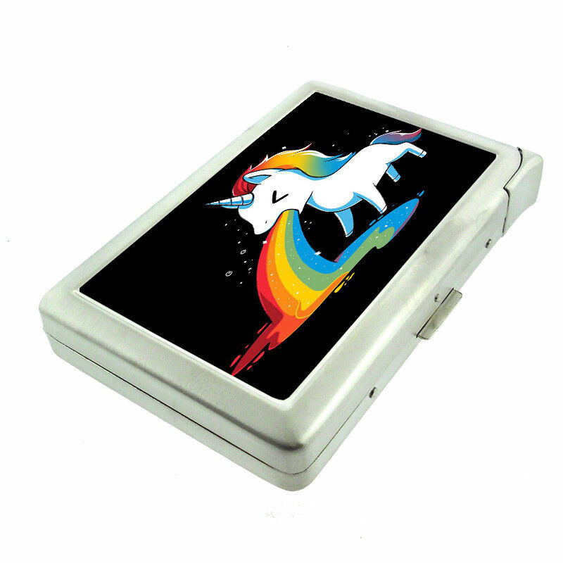 Rainbow Unicorn Em1 100's Size Cigarette Case with Built in Lighter Metal Wallet