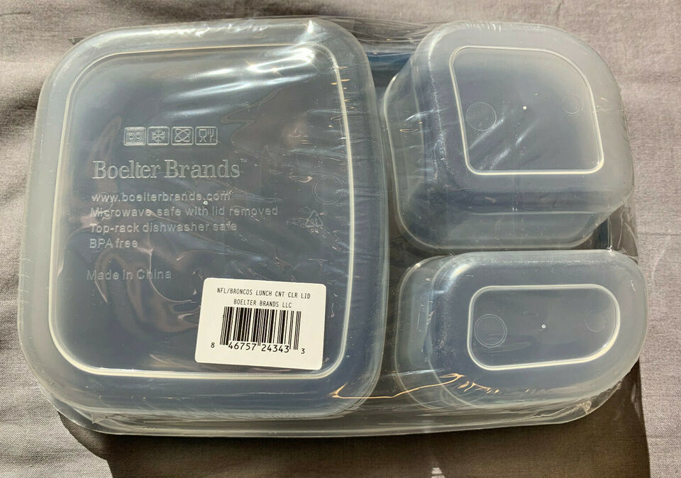 3-COMPARTMENT LUNCH CONTAINER WITH DENVER BRONCOS TEAM LOGO.