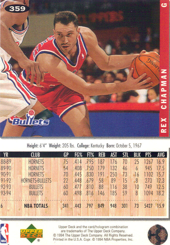 M) 1994-95 Upper Deck Basketball Trading Card Rex Chapman #359 Washington