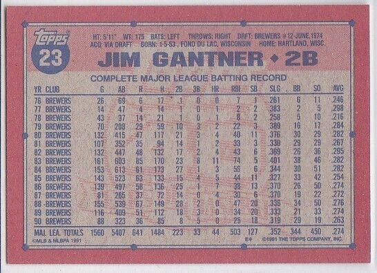 M) 1991 Topps Baseball Trading Card - Jim Gantner #23