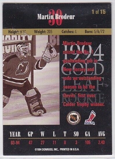 G) 1994-95 Gold Leaf Hockey Trading Card - Martin Brodeur - Rookie #1 of 15