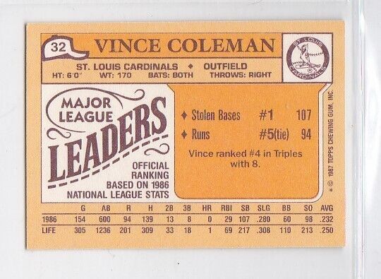 G) 1987 Topps Mini Baseball Trading Card - Vince Coleman #32