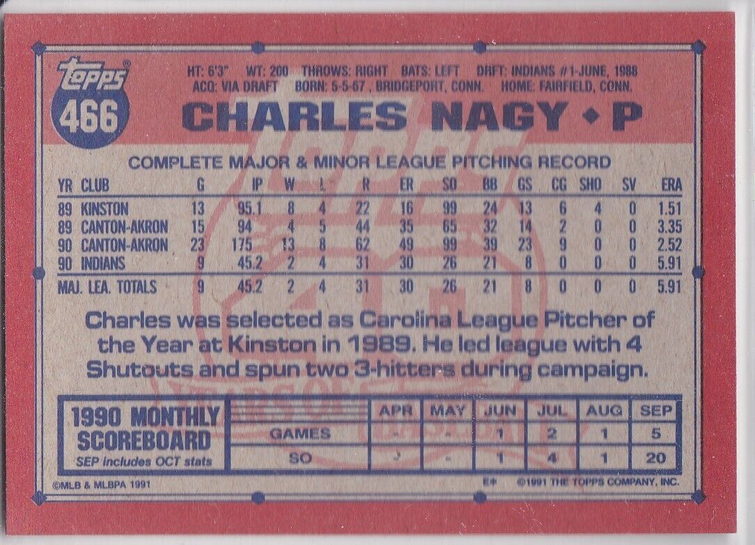 M) 1991 Topps Baseball Trading Card - Charles Nagy #466