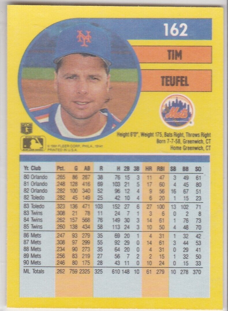 M) 1991 Fleer Baseball Trading Card - Tim Teufel #162