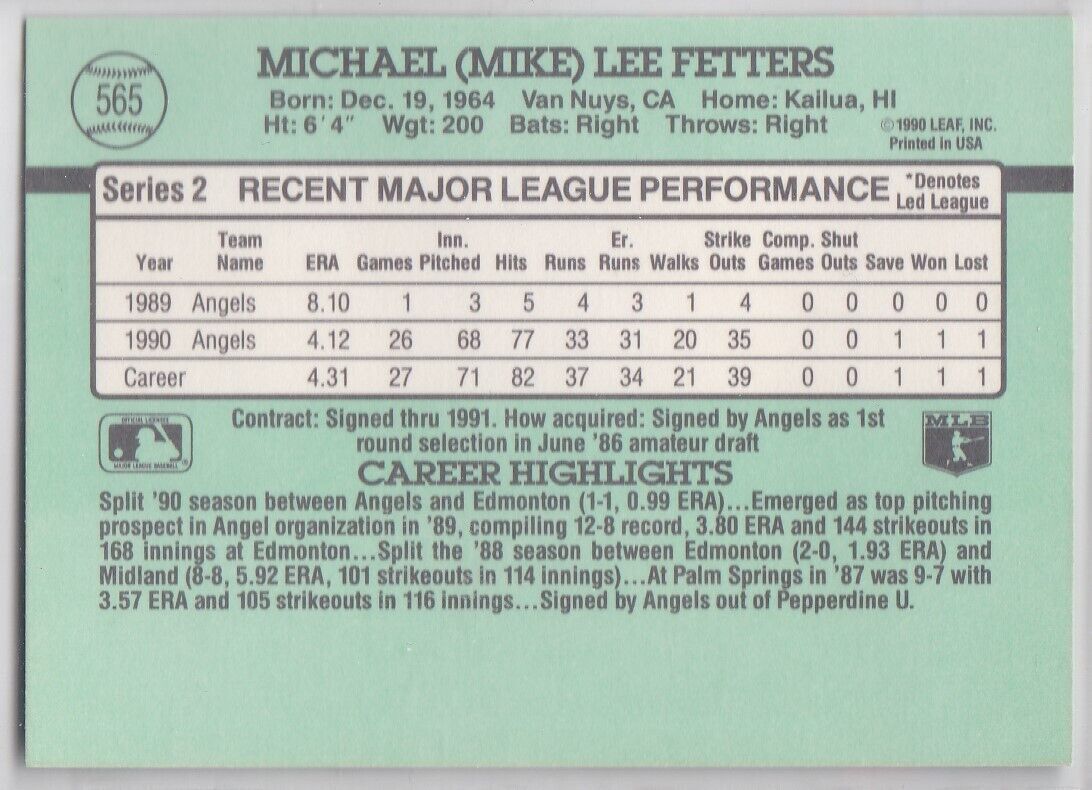 M) 1991 Donruss Baseball Trading Card - Mike Fetters #565