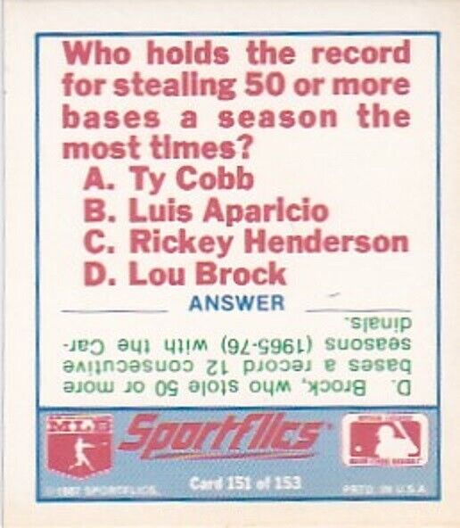 1987 Sportflics #151 Mini Baseball Trivia and 50 similar items