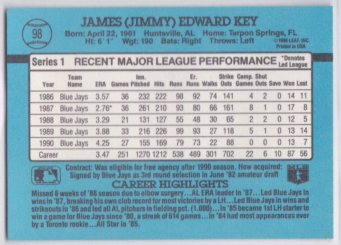 M) 1991 Donruss Baseball Trading Card - Jimmy Key #98