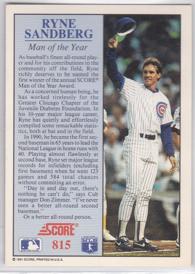 M) 1991 Score Baseball Trading Card - Ryne Sandberg #815 - Man of the Year