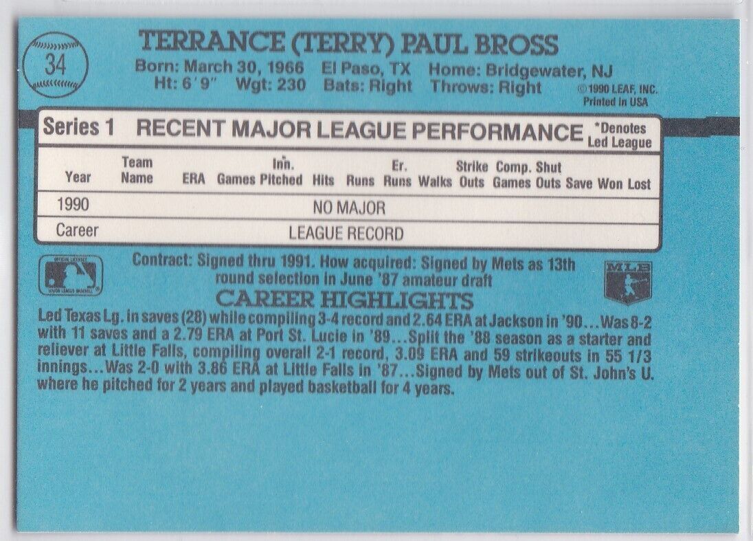 M) 1991 Donruss Baseball Trading Card - Terry Bross #34