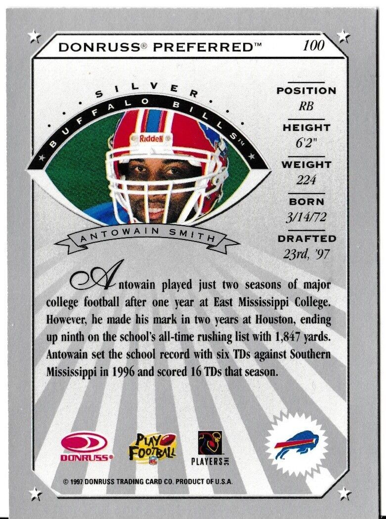 1997 Donruss Antowain Smith Football Trading Card Rookie Silver 100 Buffalo Bill