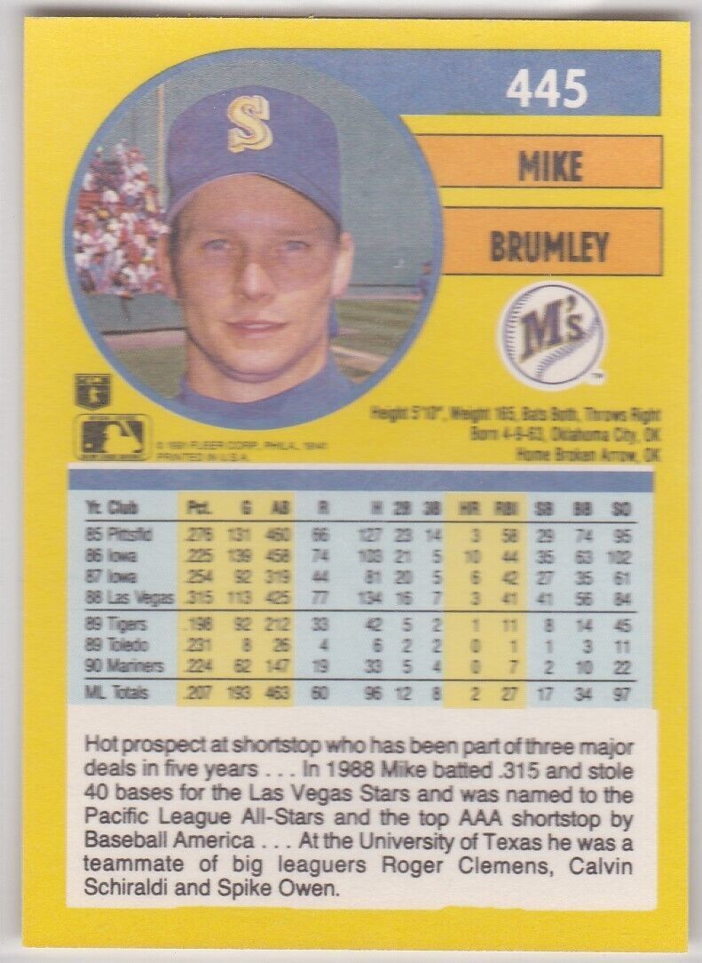 M) 1991 Fleer Baseball Trading Card - Mike Brumley #445