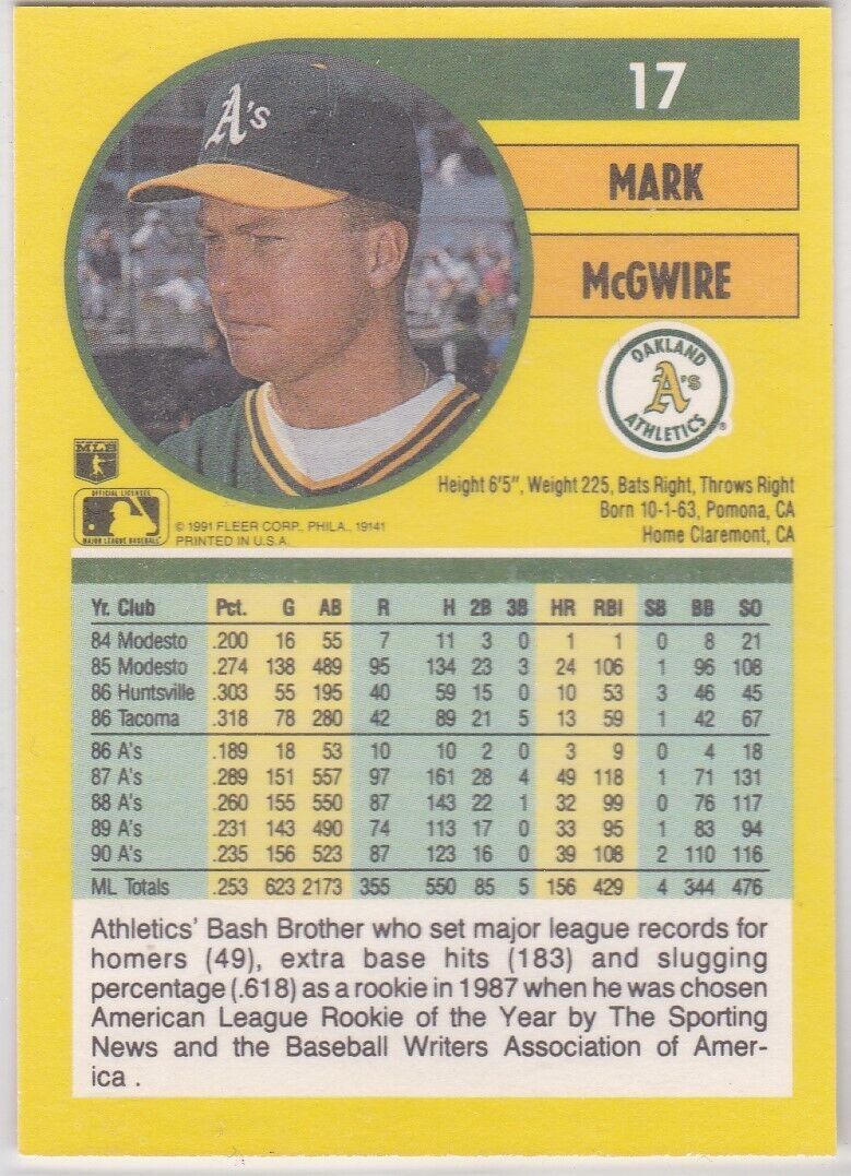 M) 1991 Fleer Baseball Trading Card - Mark McGwire #17