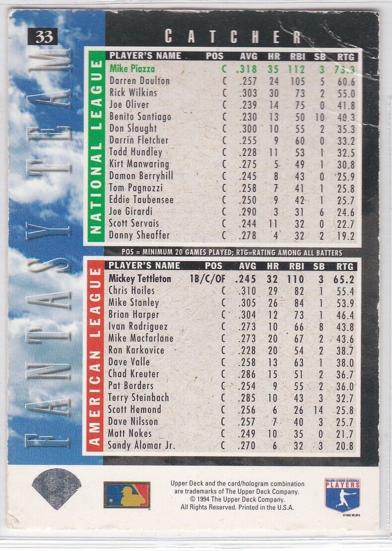 G) 1994 Upper Deck Baseball Trading Card Mike Piazza #33