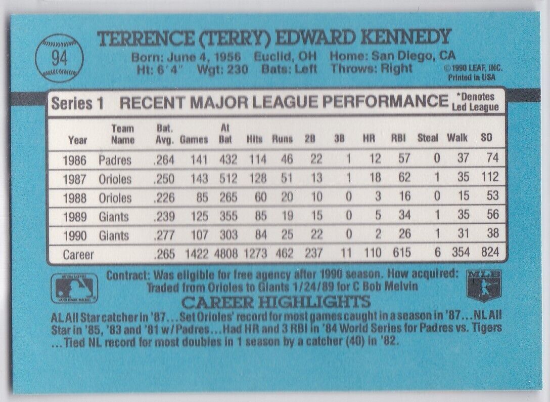 M) 1991 Donruss Baseball Trading Card - Terry Kennedy #94
