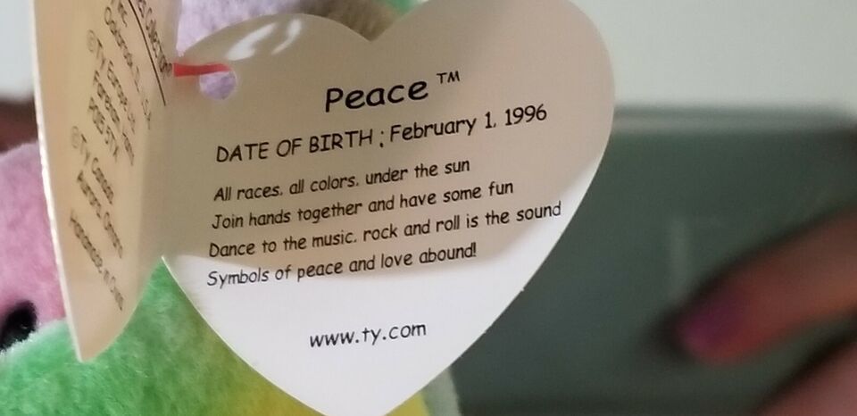 This Rare Retired Beanie Baby Is very new He has been stored in an antique store since birth This unique bear has his own special tie die coloring as all are different, Peace bear is the first beanie baby with and embroidered emblem and was introduced the same day Garcia retired ,