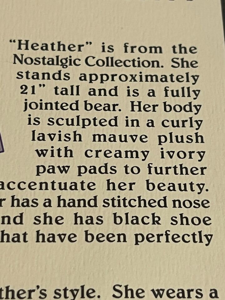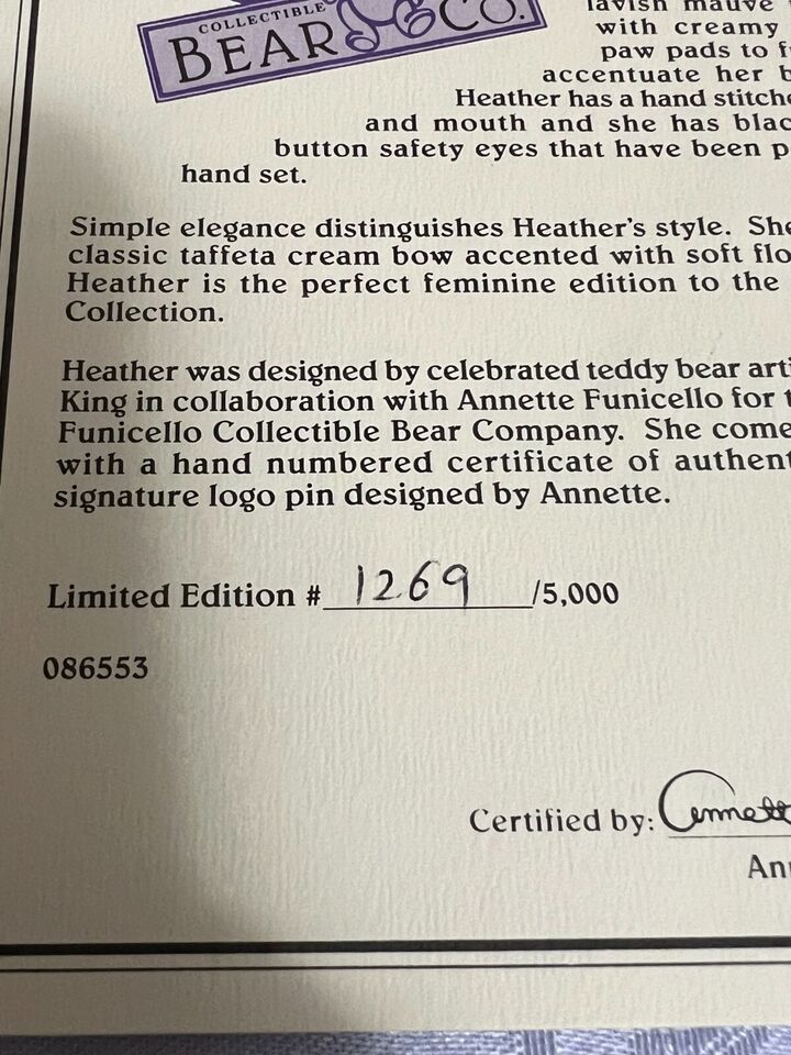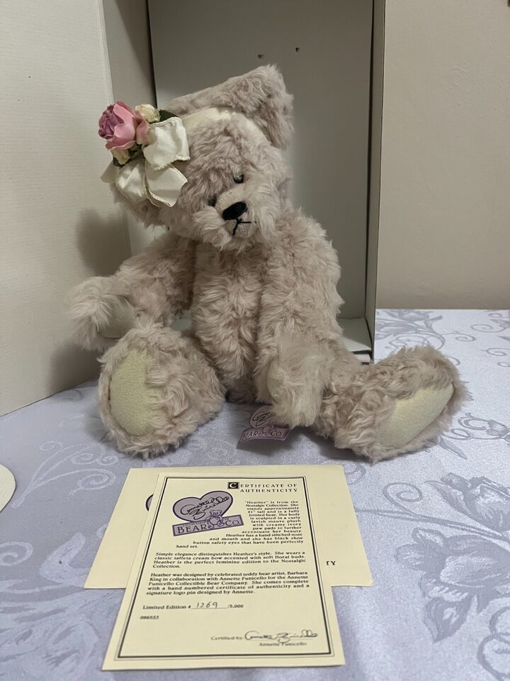 Annette Funicello Heather COA Stuffed Collectible Bear Co. Full Jointed Orig Box please see photos tape is present on the box the bear is in beautiful condition still with tags , Items are shipped out daily.