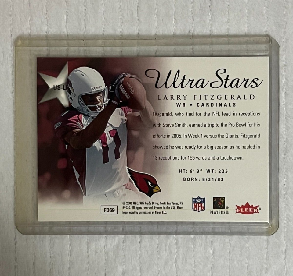 This 2006 Fleer Ultra Larry Fitzgerald Ultra Stars Jersey Card is a must-have for any Arizona Cardinals fan or collector. With its unique patch and memorabilia features, this sports trading card is a rare find. The card number is US-LF, and it is from the 2006 season.