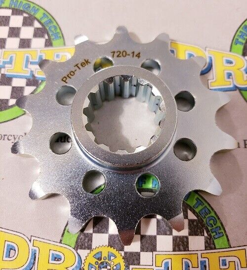Pro-tek front sprockets are completely CNC machined to exact tolerances from 4140 nickel-chromoly steel resulting in a quality product. None of the Pro-tek front sprockets are gear hobbed, but are lightened with drilled holes to save on rotating mass. Every lb of rotating mass equates to a 4 lb weight reduction. The sprockets are then case hardened to Rc 58-60 and finished with a zinc plating for added durability and protection from corrosion. Made in the USA, normally retail for $34.95. This is for a 525 Pitch front sprocket 14 or 15 tooth.