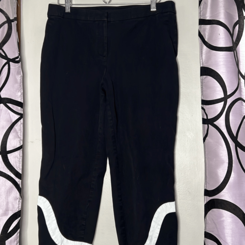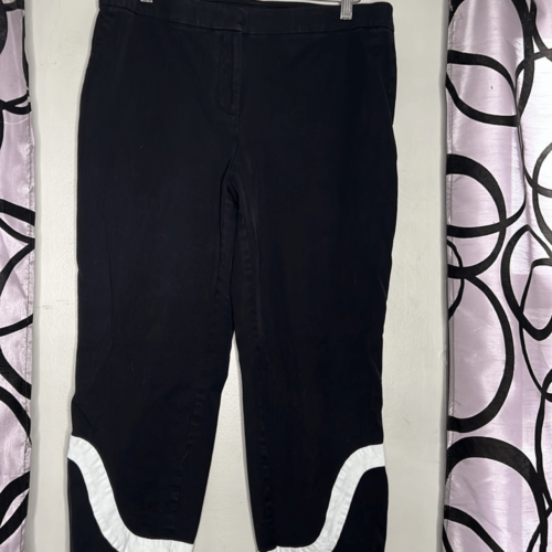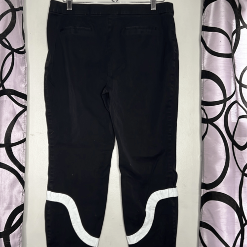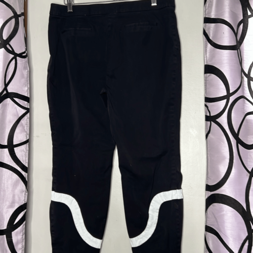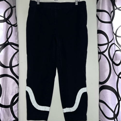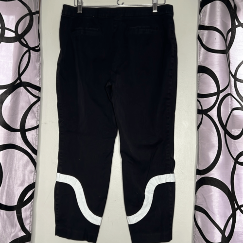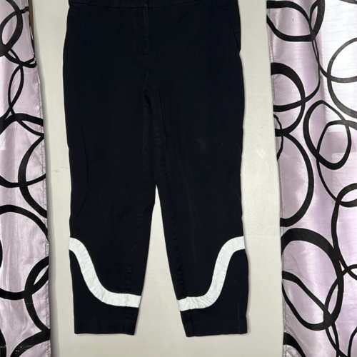Black cropped pants with white colorblock design on the legs. Zip fly with hook and bar closure and interior button. Faux pockets for decoration only. Waistband has slight stretch. High waisted. Stylish work pants! 57% cotton, 37% rayon, 6% spandex Measures Approximately: 34 inches at the waist with a 10 inch rise and an inseam of 24 inches