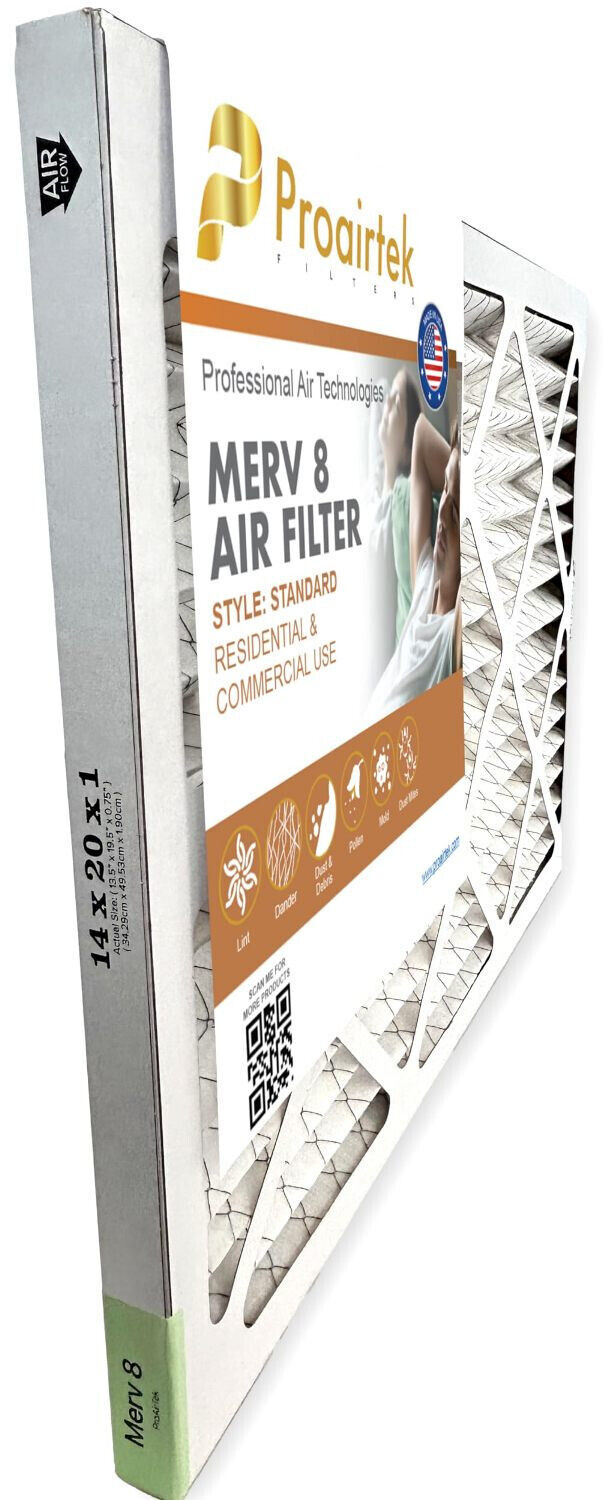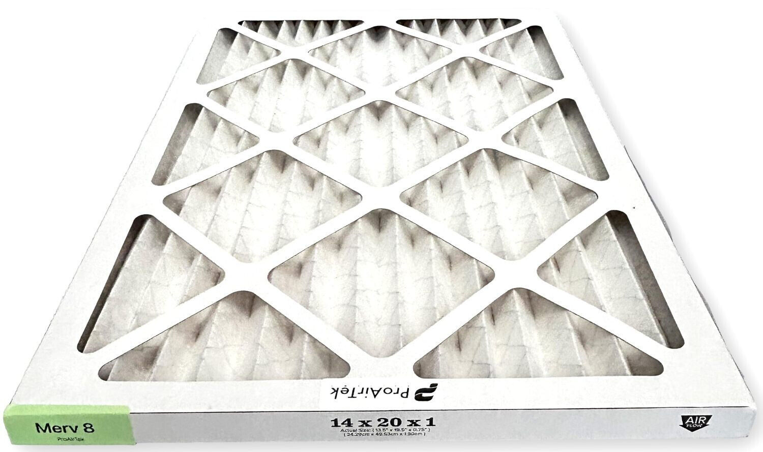 Proairtek AF14201M08SWH Model MERV 8 14x20x1 Air Filter (Pack of 6); Ideal for Anyone Wanting Clean, Crisp Air in Their Home; Captures Microscopic Airborne Particles Without Impacting Air Flow; Better Capture Coverage, and Provides Consistent, High-Performance Filtration; Functional and Aesthetic Industrial Design to Fit Any Envionment; Electrostatic Charge to Capture Particles and Allergens in the Air
